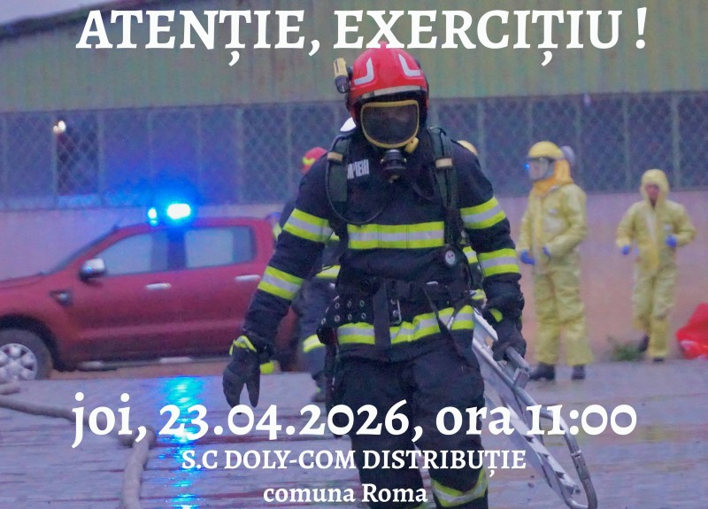 Inspectoratul pentru Situații de Urgență „Nicolae Iorga” al Județului Botoșani va desfășura astăzi, 23 aprilie 2026, începând cu ora 11:00, un amplu exercițiu cu forțe și mijloace în teren, în localitatea Roma, la sediul societății Doly-Com Distribuție SRL și în zonele adiacente.