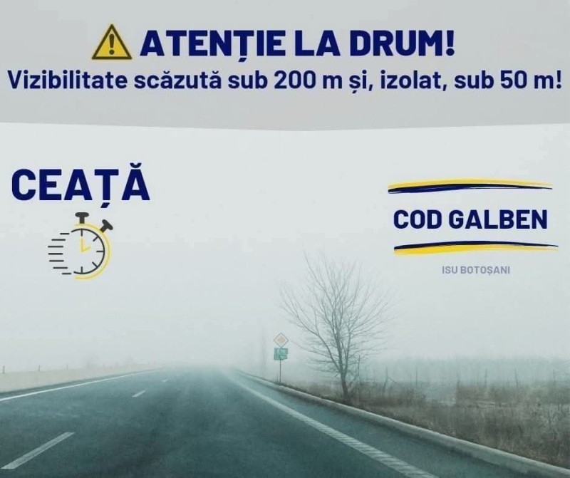Conduceți prudent! Meteorologii au emis un cod galben de ceață valabil astăzi, până la ora 10:00, pentru județul Botoșani.