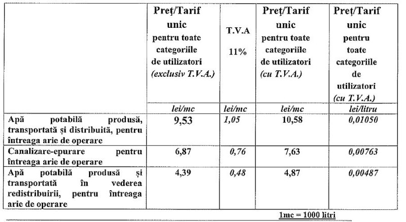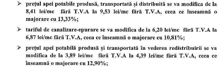 În consecință, tariful total pentru 1 mc de apă potabilă și apă uzată va ajunge de la 16,22 lei/mc cu TVA la 18,21 lei/mc cu TVA, reprezentând o majorare de 12,27%.