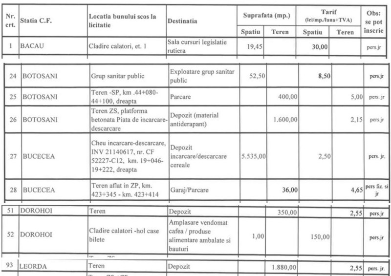 Astfel, în Gara Botoșani s-a scos ca spațiu de închiriat grupul sanitar public, o parcare, dar și un depozit de material antiderapant, în timp ce la Bucecea s-a putut închiria un teren (garaj/parcare) și un cheu de încărcare-descărcare (depozit încărcare/descărcare cereale).