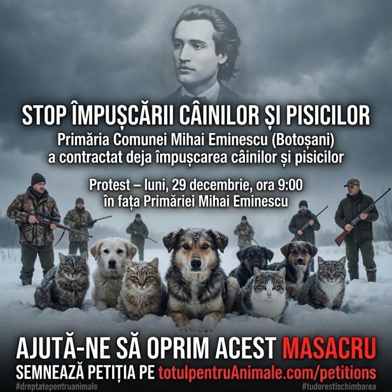 A fost inițiată și o petiție împotriva împușcării câinilor și pisicilor în comuna Mihai Eminescu, dar se are în vedere și o plângere penală depusă de asociația Dreptate pentru Animale.
