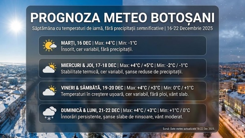 Conform meteorologilor, săptămâna 16-22 decembrie 2025 va fi caracterizată de o stabilitate termică, dar cu temperaturi sub media anilor precedenți. Maximele medii vor fi de 3-4°C, iar minimele vor oscila între -2°C și +1°C. Absența precipitațiilor semnificative reduce riscul de polei sau viscol, dar se recomandă îmbrăcăminte adecvată pentru frig.