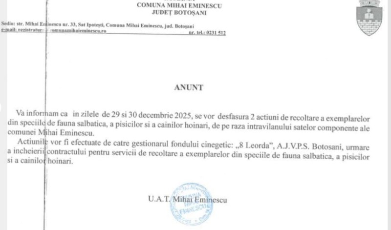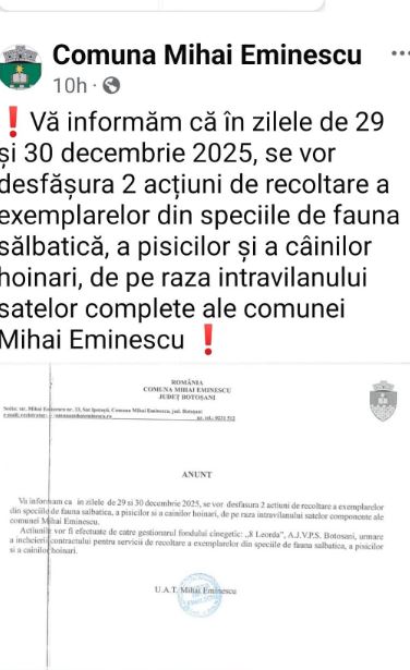Un anunț publicat de Primăria Comunei Mihai Eminescu, județul Botoșani, prin care erau anunțate acțiuni de „recoltare” a animalelor, inclusiv câini și pisici fără stăpân, în intravilanul satelor, a declanșat un val masiv de indignare în mediul online și reacții dure din partea societății civile.