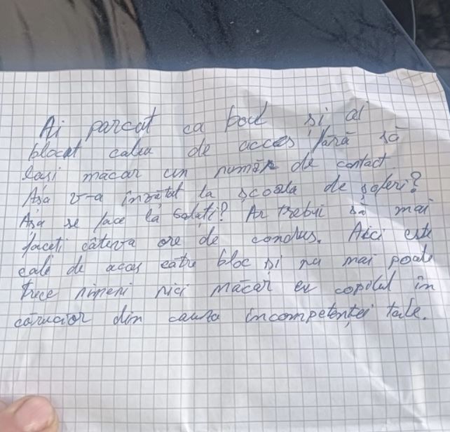 „Ai parcat ca boul și ai blocat calea de acces. Să lași măcar un număr de contact. Așa v-a învățat la școala de șoferi? Ar trebui să mai faceți câteva ore de condus. Aici este cale de acces către bloc și nu mai poate trece nimeni, nici măcar cu copilul în cărucior, din cauza incompetenței tale”, scria în mesajul lăsat de un cetățean.