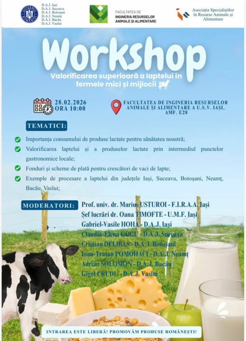 Direcțiile pentru Agricultură Județene Iași, Suceava, Botoșani, Neamț, Bacău și Vaslui, în parteneriat cu Facultatea de Ingineria Resurselor Animale și Alimentare – U.S.V. Iași și Asociația Specialiștilor în Resurse Animale și Alimentare, organizează un workshop dedicat crescătorilor de vaci de lapte, specialiștilor și tuturor celor interesați de dezvoltarea sectorului lactatelor.