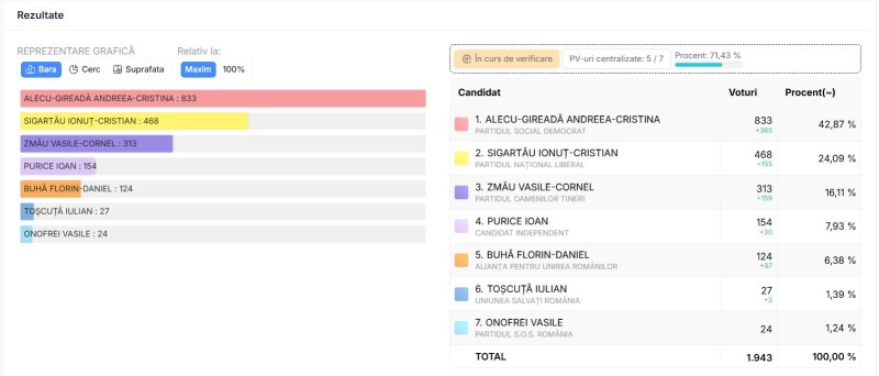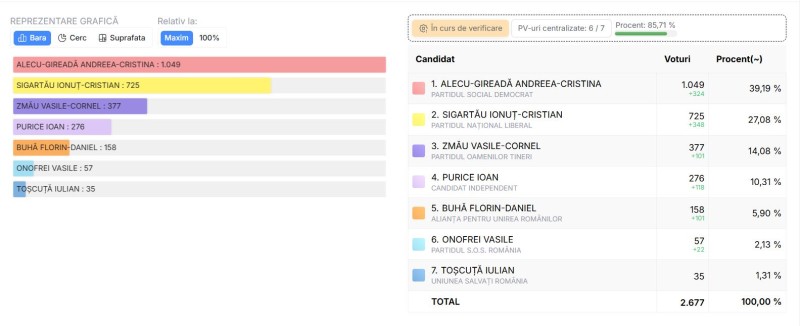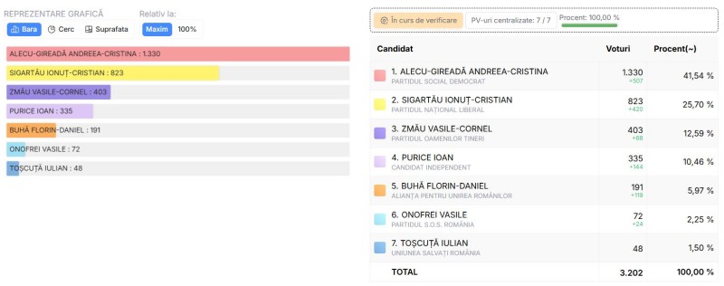 Potrivit rezultatelor parțiale (la numărărarea a peste 57% din voturi), Andreea-Cristina Alecu-Gireadă, candidata social-democraților a obținut 745 de voturi (47,8%), pe locul doi situându-se candidatul PNL, Ionuț-Cristian Sigartău, cu 421 de voturi (27%).