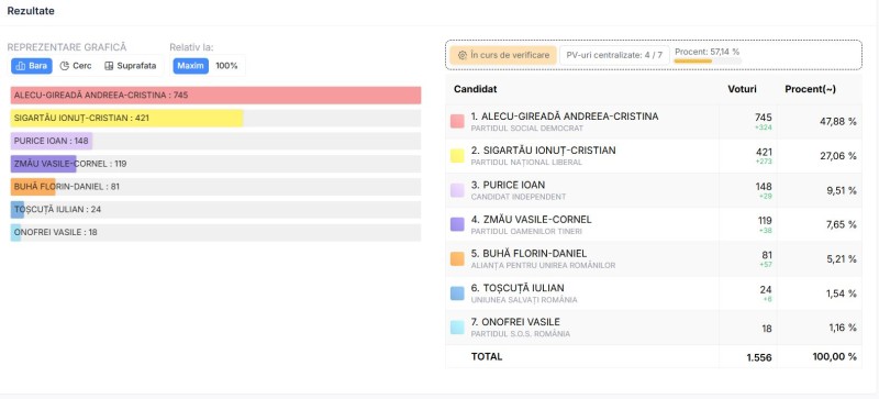 La aproape 60% din voturi centralizate, Andreea-Cristina Alecu-Gireadă are deja un avans semnificativ față de următorul clasat.