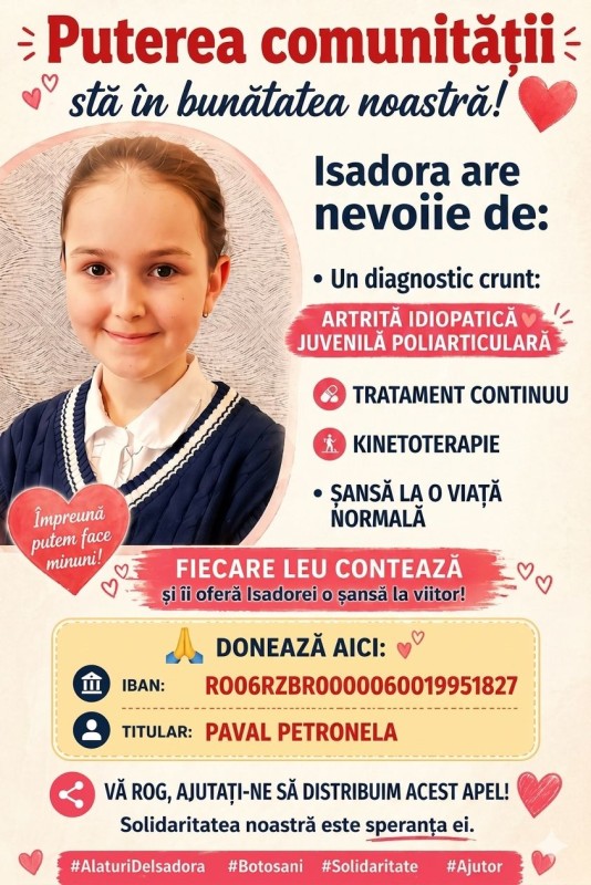 ”Dragi prieteni, astăzi vin către voi cu o rugăminte din suflet. Isadora este colega de școală a fiicei mele, Teodora, la Școala Gimnazială Nr. 12 din Botoșani”, este mesajul transmis de jurnalistul Ionuț Tăbultoc.