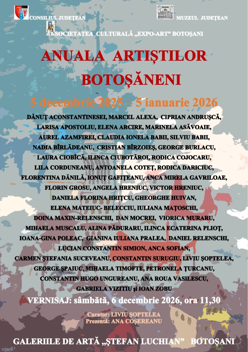 Muzeul Judeţean Botoșani găzduiește, în perioada 5 decembrie 2025 – 5 ianuarie 2026, în spațiul Galeriilor de Artă „Ștefan Luchianˮ Botoșani, expoziția ”Anuala artiștilor botoșăneni”, eveniment organizat de Societatea Culturală „Expo-Art” Botoșani și curatoriat de artistul Liviu Șoptelea.