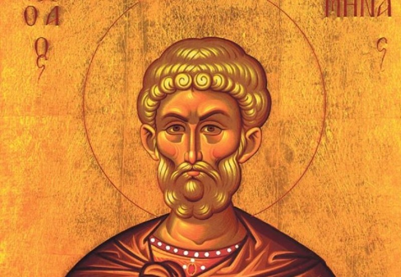 Sfântul Mina a trăit pe vremea lui Diocleţian şi Maximian (286- 305) şi era din Egipt, creştin cu cre­dinţa, iar cu slujba ostaş din ceata tribunului Firmilian, aflându-se cu trupa sa în cetatea Cotiani din Frigia. În întreg Imperiul Roman, creştinii erau aspru pedepsiţi cu chinuri şi cu moarte pentru credinţa lor. Atunci, fericitul Mina, nesuferind să vadă cinstindu-se rătăcirea păgânească şi închinarea la idolii cei fără suflare, a lepădat ostăşia şi s-a dus în munţi, în pus­tie, vieţuind mai bine cu fiarele sălbatice decât cu un popor care nu-l cunoaşte pe Dumnezeu. După multă vreme, în cetatea Cotiani s-a făcut praznic mare în cinstea zeilor păgâni. Deci, Sfântul Mina, umplându-se de râvnă pentru Dumnezeu, a venit în cetate şi L-a propovăduit cu mult curaj pe Hristos Iisus Mântuitorul. Pentru aceasta a fost prins şi dus înaintea lui Arghirisc dregătorul, care a poruncit să fie bătut cu vergi şi târât prin cioburi ascuţite. L-au frecat apoi cu gheme de păr aspru, fără milă, l-au ars cu făclii şi l-au tras pe roată. Dar Dumnezeu îşi întărea Mucenicul care, rămânând nestrămutat în credinţă, striga că nu se va lepăda de Hristos. Pentru aceasta, închinătorii la idoli i-au tăiat capul Sfântului Mina. Fragmente din sfintele sale moaşte se află şi în Bucureşti, la biserica ce îl are ca ocrotitor (Biserica „Sfântul Mina”-Vergu, Protopopiatul Sector 3 Capitală).