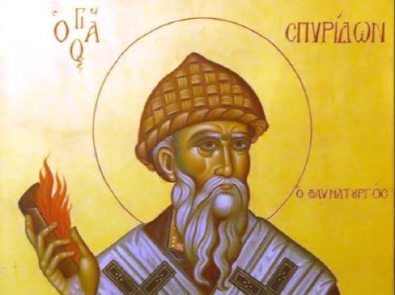 Sfântul Ierarh Spiridon, făcătorul de minuni, era de neam din Cipru şi a trăit pe vremea împăraţilor Constantin cel Mare (306-337) şi Constanţiu (337-361). Era un om smerit cu inima. A fost păstor de oi, apoi s-a însurat, iar după moartea soţiei sale a fost ales Episcop în Trimitunda, aproape de Salamina. Deoarece Dumnezeu i-a dat harul tămăduirilor, a fost numit făcător de minuni. În vremea prigonirii creştinilor de către Maximian şi Galeriu, sfântul a fost prins şi, mărturisind pe Hristos, i s-a scos ochiul drept şi i s-a tăiat pulpa stângă. A luat parte la Sinodul I Ecumenic de la Niceea, din anul 325, fiind unul dintre cei 318 Părinţi care au mărturisit deofiinţimea Persoanelor Sfintei Treimi. Sfântul Ierarh Spiridon a arătat printr-o minune taina Sfintei Treimi, căci, luând o cărămidă, a făcut prin rugăciune ca aceasta să se desfacă în stihiile din care era alcătuită: pământ, apă şi foc. Sfântului Ierarh Spiridon i se arătau îngerii lui Dumnezeu în timp ce el săvârşea Sfânta şi Dumnezeiasca Liturghie. Şi aşa, păstorind cu multă grijă turma cea cuvântătoare încredinţată lui, s-a mutat în pace la cereştile locaşuri. Sfintele moaşte ale Sfântului Ierarh Spiridon sunt păstrate cu cinste, până astăzi, într-o raclă, în insula Corfu. Fragmente din sfintele sale moaşte se găsesc şi la Catedrala Mitropolitană „Sfântul Spiridon”-Nou din Bucureşti, Paraclis Patriarhal, precum şi la Biserica „Sfântul Spiridon”-Vechi din Capitală.