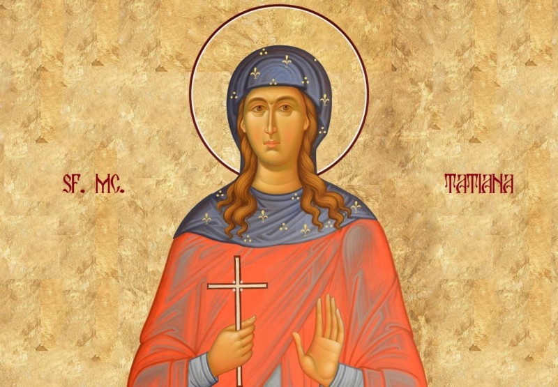 Sfânta Muceniţă Tatiana (†230) era din vechea Romă şi a trăit pe vremea împăratului Alexandru Sever (222-235). S-a născut din părinţi credincioşi, iar tatăl ei era consul, bucurându-se de multă cinste în senatul roman, neştiindu-se că este creştin. Şi a crescut Tatiana în casa părinţilor ei cu bună-cuviinţă şi cu frică de Dumnezeu, învăţând tainele credinţei creştine. Ajungând la vârsta maturităţii, fericita nu a voit să se mărite, ci îşi petrecea viaţa în curăţie şi în dragoste faţă de Hristos, dorind din tot sufletul să fie mireasa Lui. Sfânta Muceniţă Tatiana şi-a dedicat întreaga viaţă lui Dumnezeu, căruia Îi slujea ziua şi noaptea, împodobindu-se cu fapte bune. Aceasta s-a învrednicit de cinstea de a fi diaconiţă a Bisericii din Roma, după rânduielile de atunci ale Bisericii. În acea vreme, deşi împăratul nu prigonea el însuşi, totuşi îi lăsa pe dregătorii mai mici să facă ce vor cu creştinii. Deci, pornindu-se prigoană împotriva creştinilor, Tatiana a fost prinsă şi dusă în templul zeului Apolo, dar sfânta s-a rugat lui Dumnezeu şi idolul a căzut la pământ, sfărâmându-se. Atunci, din porunca mai-marilor cetăţii, a fost supusă unor chinuri cumplite: bătăi, scoaterea ochilor, golătatea trupului, scrijelirea pe trup cu unghii mari de fier, aruncarea la fiare sălbatice, aruncarea în foc, spânzurarea şi strujirea trupului la stâlp şi multe altele. Pe toate le-a îndurat cu putere de sus, de parcă nu simţea nici o durere, propovăduind neîncetat pe Hristos, încât mulţi necredincioşi veneau la adevărata credinţă. Atunci, au poruncit să li se taie capul atât ei, cât şi tatălui ei. Capul sfintei se află astăzi în Catedrala Mitropoliei Olteniei din Craiova, fiind adus în ţară de Sfântul Voievod Neagoe Basarab (1512-1521).