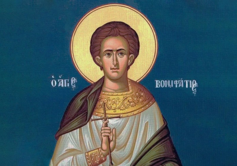 Sfântul Bonifatie (†307) a trăit pe vremea împăratului Diocleţian (284-305) şi era robul unei femei de neam mare, Aglaia, fiica proconsulului Romei. Bonifatie trăia în păcate trupeşti cu stăpâna lui şi era beţiv, dar era milostiv, iubitor de străini şi, la fel ca stăpâna lui, avea mare evlavie către Sfinţii Mucenici. De asemenea, îi miluia pe cei lipsiţi şi îi asculta pe cei suferinzi. Adeseori, Bonifatie şi Aglaia se pocăiau, suspinând către Domnul pentru păcatele lor, şi de aceea Dumnezeu nu i-a lăsat mai mult să se întineze cu desfrânarea, ci a rânduit o spălare de întinările lor. Într-o zi, Aglaia i-a spus lui Bonifatie să meargă şi să-i aducă moaşte de Mucenici, pentru a le păstra spre ajutor şi mântuire sufletească. El i-a răspuns: Dacă îţi voi aduce moaştele mele, ai să le primeşti? Iar ea a râs, zicându-i: Beţivule! Şi, dându-i unele sfaturi, s-a rugat pentru el, i-a dat bani şi l-a trimis. Şi a plecat Bonifatie, însoţit de 12 slujitori, în Tarsul Ciliciei, unde erau chinuiţi creştinii şi, văzând el suferinţele lor, aprinzându-se de râvnă dumnezeiască, a mărturisit că este creştin. Pentru aceasta a fost supus la cumplite chinuri. A fost spânzurat cu capul în jos, iar păgânii i-au tăiat tot trupul, după care l-au împuns cu trestii ascuţite pe sub unghii, i-au turnat plumb topit în gură şi l-au băgat cu capul într-un cazan plin cu smoală clocotită. Prin puterea lui Dumnezeu, din toate chinurile, Bonifatie a ieşit însă nevătămat. În cele din urmă i s-a tăiat capul. Slugile sale au cumpărat trupul său cu 500 de galbeni, l-au uns cu mir, l-au înfăşurat în giulgiuri şi l-au dus la Aglaia, care l-a îngropat cu mare cinste. Mai târziu, ea a zidit în Roma o biserică în numele Sfântului Bonifatie şi i-a mutat acolo moaştele. Aglaia, trăind de atunci în curăţie, cu pace şi-a dat sufletul în mâinile lui Dumnezeu.