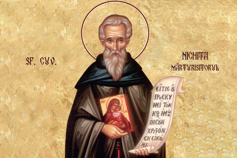 Sfântul Cuvios Nichita Mărturisitorul, egumenul Mănăstirii Midichiei, s-a născut în Cezareea Bitiniei, într-o familie de oameni evlavioşi şi rugători. La scurt timp după naşterea sa, a rămas orfan de mamă şi a fost crescut de bunica sa. Iubitor de curăţie şi sfinţenie încă din copilărie, a devenit ucenic al pustnicului Ştefan, care l-a trimis la Mănăstirea Midichiei, de pe muntele Olimp. Bătrânul şi înţeleptul egumen Nichifor l-a primit cu multă dragoste şi doar la 7 ani de când venise la acel aşezământ monahal l-a propus spre hirotonie Sfântului Patriarh Tarasie al Constantinopolului (784-806), ctitorul mănăstirii. Odată cu hirotonia, i s-a încredinţat şi toată rânduiala mănăstirii, ca ajutor al Cuviosului Nichifor, care era slăbit de bătrâneţe. Pentru că a crescut mult numărul călugărilor în acest timp şi fiind iubit de aceştia, după moartea bătrânului egumen, Nichita a fost ales egumen al mănăstirii. Şi aşa, vieţuind în toată fapta cea bună, a ajuns la anii bătrâneţilor, dar şi la vremea mărturisirii şi a pătimirii celei vitejeşti. În timpul împăratului Leon Armeanul, în anul 813, când au fost prigoniţi cinstitorii sfintelor icoane, Cuviosul Nichita a fost trimis în exil pentru credinţa sa mărturisită la Sinodul al 7-lea Ecumenic. Slăbit de suferinţe şi bătrâneţe, la sfârşitul prigoanei, în anul 820, Sfântul Nichita s-a retras într-un schit de unde s-a mutat la Domnul, în anul 824.