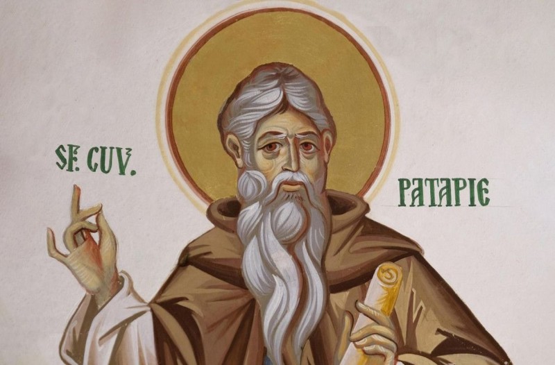 Cuviosul Patapie era de loc din Teba Egiptului şi alegând viaţa călugărească a urmat lui Hristos, nevoindu-se mulţi ani în pustie. Apoi, a venit la Constantinopol, unde a făcut multe şi mari minuni: le-a redat orbilor vederea, i-a tămăduit pe cei care sufereau de hidropizie, ungându-i cu untdelemn sfinţit, a izgonit demonii şi a vindecat bolile cele greu de vindecat. Sfântul Cuvios Patapie, după ce a trăit o viaţă sfântă, în conformitate cu învăţăturile Evangheliei, şi-a dat sufletul lui Dumnezeu în pace. În vremea stăpânirii turceşti, sfintele sale moaşte au fost ascunse de monahi într-o peşteră din munţii Gherania, în apropierea satului Lutraki, de lângă Corint, unde au rămas uitate vreme de aproape patru veacuri, fiind descoperite în chip minunat în anul 1904. De aceea, acolo s-a întemeiat o mănăstire, unde credincioşii vin spre a cinsti moaştele întregi şi bine înmiresmate ale Cuviosului Patapie, făcătorul de minuni.