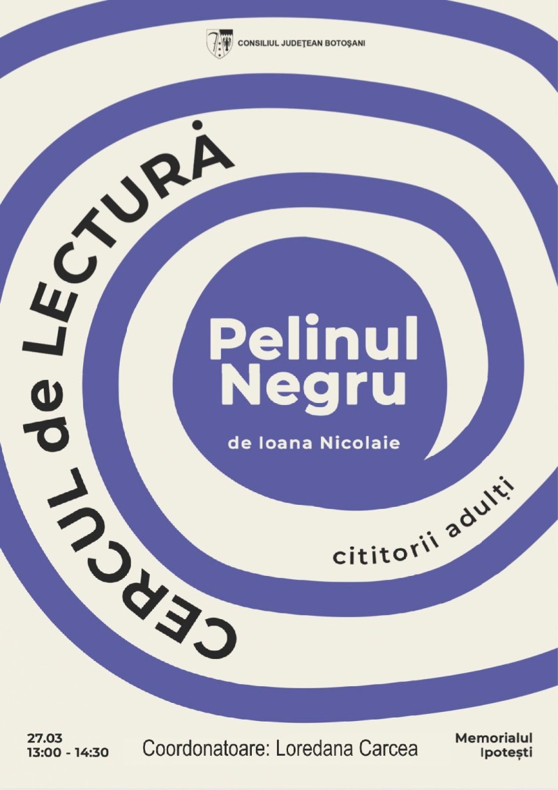 Pe 27 martie 2026, de la ora 13.00, în Amfiteatrul „Laurențiu Ulici”, la Memorialul Ipotești, iubitorii de cărți și de literatură, membrii Cercului de lectură pentru adulți - susținut de Memorialul Ipotești și coordonat de prof. Loredana Carcea - se vor întâlni din nou, de data aceasta pentru a pune în discuție romanul Ioanei Nicolaie, Pelinul negru.