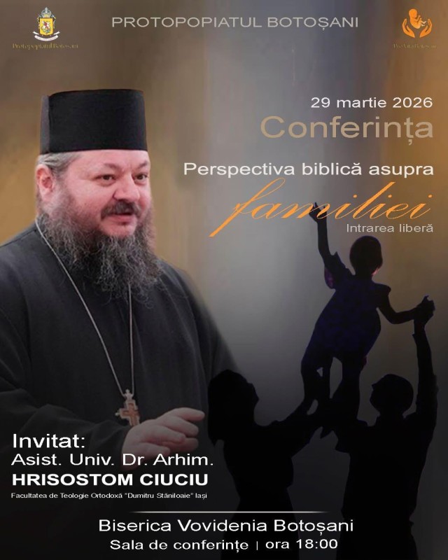 Arhimandritul Hrisostom Ciuciu de la Mănăstirea Putna va susține la Biserica Vovidenia din municipiul Botoşani o conferință duhovniceascǎ cu tema “Perspectiva biblică asupra familiei”.