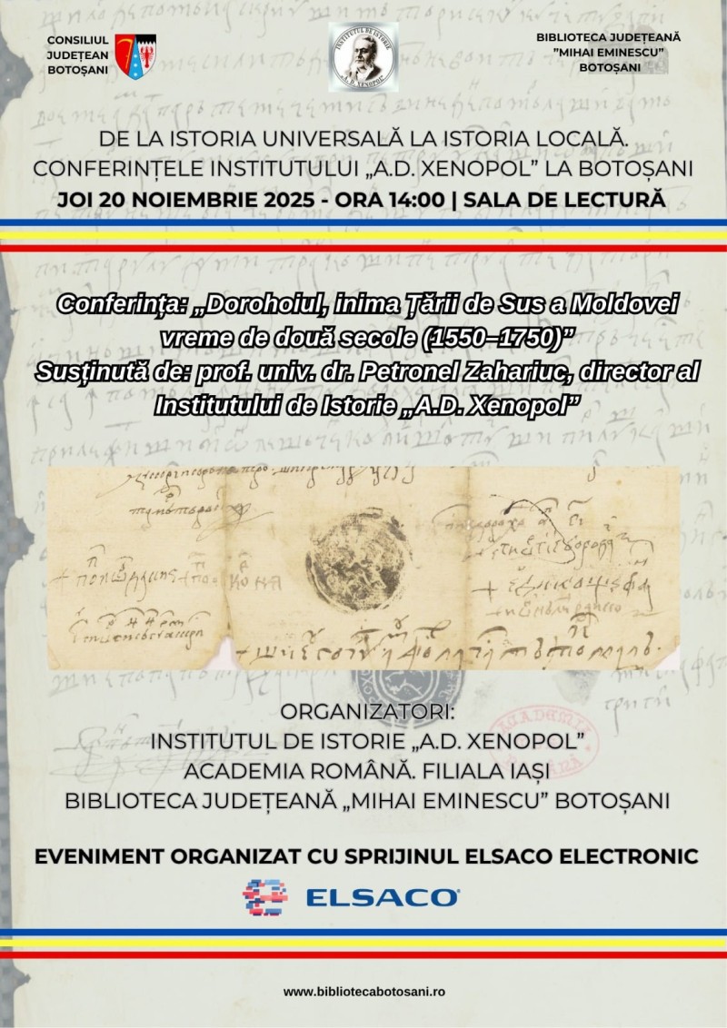 Institutul de Istorie „A.D. Xenopol” - Academia Română, filiala Iași, împreună cu Biblioteca Județeană „M. Eminescu” din Botoșani, vă invită la conferința Dorohoiul, inima Țării de Sus a Moldovei vreme de două secole (1550-1750), susținută de prof. univ. dr. Petronel Zahariuc (director al Institutului de Istorie „A.D. Xenopol”).