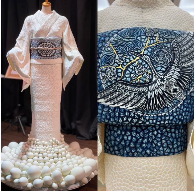 Și totuși, ceea ce vedea acum o uimea dincolo de tot ce știa, dincolo de orice lecție predată. Pentru că în fața ei nu era mătase. Nu era brocart, satin sau crep. Era doar coajă de ou. Un kimono ce nu fusese țesut, fusese construit. Fragment cu fragment. Detaliu cu detaliu. Sute de linii „sculptate” cu motive românești și simboluri japoneze, mii de fragmente unite cu o uluitoare măiestrie.