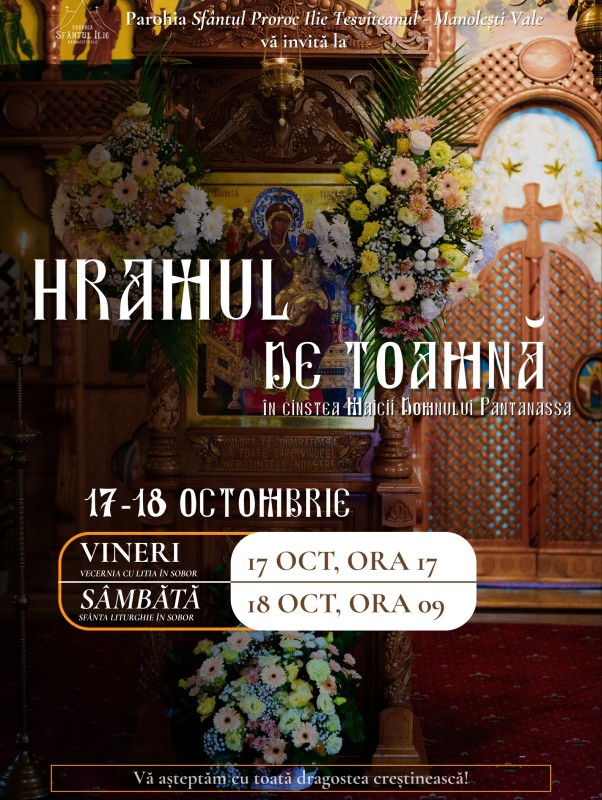 În zilele de 17 și 18 octombrie 2025, Parohia Manolești Vale își va serba hramul de toamnă, în cinstea Icoanei Maicii Domnului „Pantanassa” – Izbăvitoarea de cancer, precum și a Sfântului Apostol și Evanghelist Luca, cel care, potrivit tradiției, a fost întâiul iconar al Maicii Domnului și a zugrăvit prima icoană a Preasfintei Fecioare cu Pruncul în brațe.