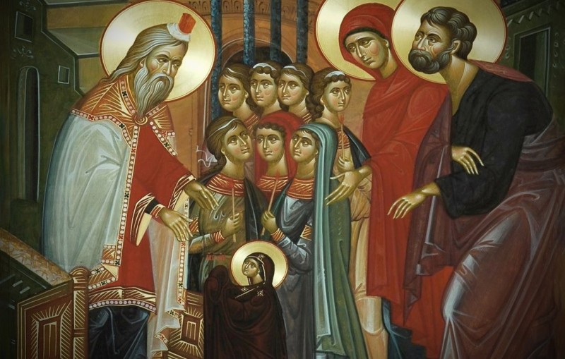 Praznicul Intrării în biserică a Maicii Domnului semnifică aducerea Fecioarei Maria la templul din Ierusalim, la vârsta de 3 ani, de către părinţii săi, Ioachim şi Ana. Sfânta Ana nu putea să nască prunci şi de aceea, luând îndemn din Cartea Sfântă, din cele ce s-au petrecut cu cealaltă Ana (care fusese şi ea stearpă, mama prorocului Samuel), se ruga fierbinte lui Dumnezeu, împreună cu bărbatul ei Ioachim, să le dăruiască un copil. Şi au făgăduit Sfinţii Ioachim şi Ana că dacă le va fi îndeplinită cererea, vor închina pruncul Domnului. Şi aşa a născut-o Sfânta Ana pe Fecioara Maria, Născătoarea de Dumnezeu. Pe când avea 3 ani au luat-o părinţii ei şi au dus-o la templu, încredinţând-o preoţilor. Deci, luând-o arhiereul cel de atunci, Zaharia, a dus-o în Sfânta Sfintelor, locul unde o dată pe an intra singur arhiereul să aducă jertfe lui Dumnezeu. Şi a rămas fecioara la templu timp de 12 ani. Acolo existau trei rânduri de chilii în care locuiau cu frică de Dumnezeu fecioare şi văduve afierosite lui Dumnezeu, precum şi preoţii şi slujitorii. În tot acest timp, Fecioara Maria, sub îndrumarea fecioarelor mai în vârstă, citea dumnezeieştile Scripturi şi îndeosebi se ruga mult. Celei îmbrăcate cu credinţă şi cu înţelepciune şi cu neîntinata feciorie, mai-marele Gavriil i-a adus din ceruri închinăciune. Fecioara Maria a fost condusă în acel loc sfânt, în Sfânta Sfintelor, ca să devină ea însăşi „Sfânta Sfintelor” lui Dumnezeu, Biserică vie şi Templu al Pruncului dumnezeiesc, Mântuitorul nostru Iisus Hristos.