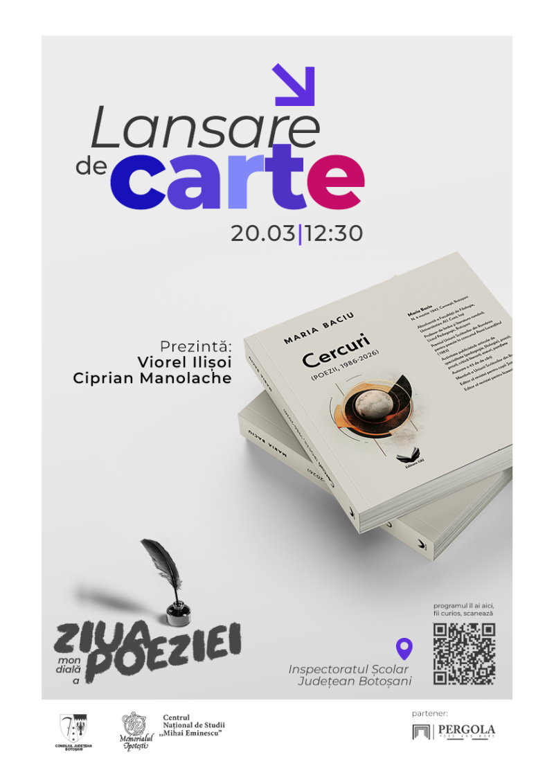 Pe 20 martie 2026, Memorialul Ipotești – Centrul Național de Studii „Mihai Eminescu”, instituție din subordinea Consiliului Județean Botoșani, organizează, în cadrul Zilei Mondiale a Poeziei, lansarea volumului Cercuri (Poezii, 1986-2026) de Maria Baciu (Iași, Editura GRI, 2026).