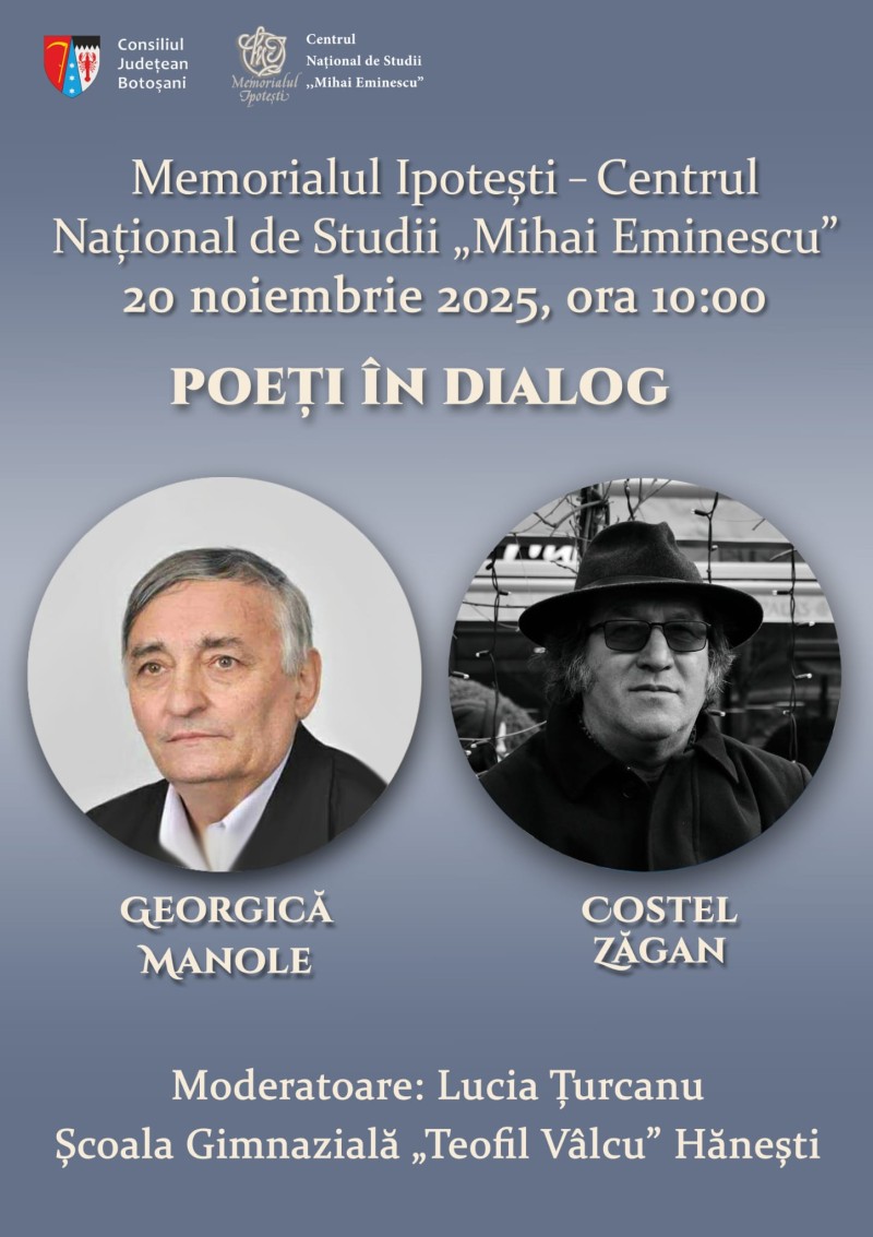 Memorialul Ipotești – Centrul Național de Studii „Mihai Eminescu”, instituție din subordinea Consiliului Județean Botoșani, organizează, joi, 20 noiembrie 2025, începând cu ora 10:00, o nouă ediție a întâlnirilor Poeți în dialog. Invitații lunii noiembrie sunt poeții botoșăneni Georgică Manole și Costel Zăgan.