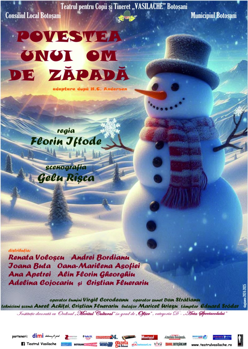 Duminică, 18 ianuarie 2026, de la orele 11:00 şi 12:30, la Teatrul pentru Copii şi Tineret „Vasilache” are loc spectacolul „Povestea unui om de zăpadă”, adaptare după H.C. Andersen.