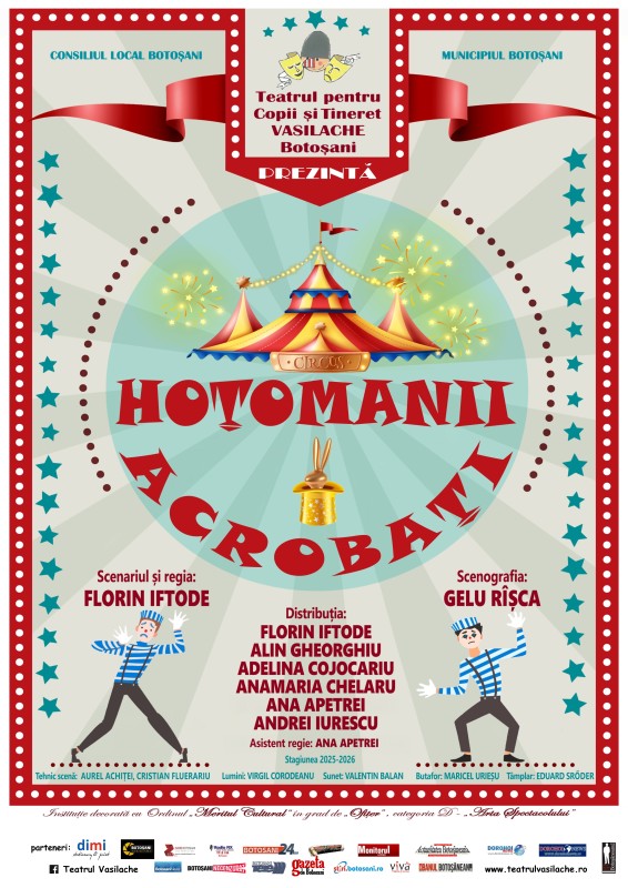 Copii sunt invitați, în zilele de joi, 4 decembrie 2025, de la ora 18:00, și duminică, 7 decembrie 2025, de la orele 11:00 și 12:30, la Teatrul pentru Copii şi Tineret „Vasilache” prentru a viziona în premieră spectacolul „Hoțomanii acrobați”.