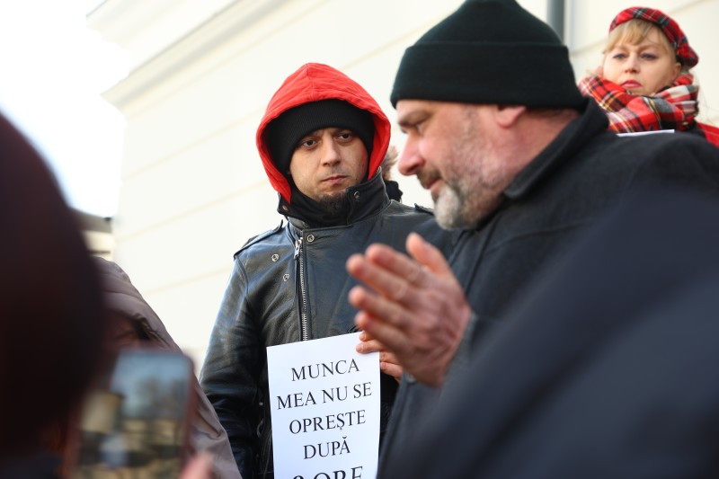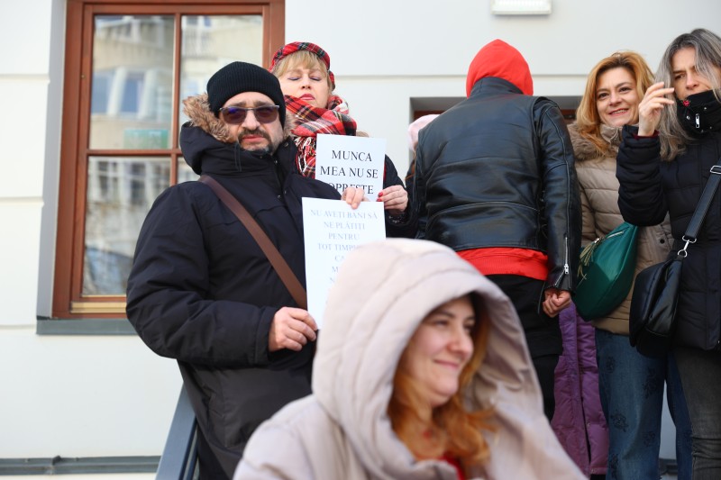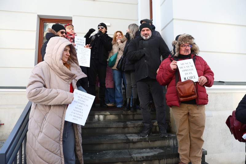 ”Munca mea nu se oprește după 8 ore”, ”Nu aveți bani să ne plătiți pentru tot timpul în care mintea noastră este ocupată cu meseria asta”. Sunt mesajele care i-au însoțit, marți la amiază, pe actorii din Botoșani la protestul spontan organizat la sediul Teatrului ”Mihai Eminescu”.