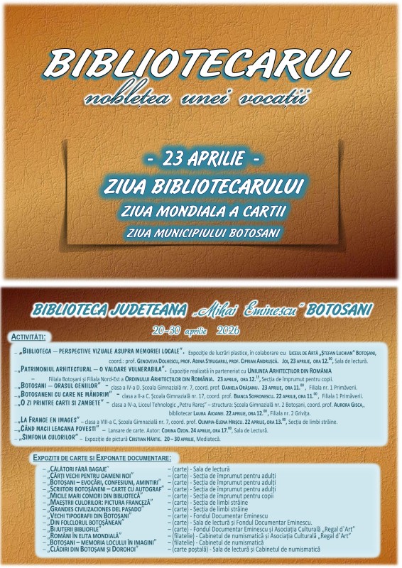 Biblioteca Județeană „Mihai Eminescu” Botoșani marchează Ziua Bibliotecarului din România și Zilele Municipiului Botoșani printr-o serie de activități culturale dedicate promovării memoriei locale botoșănene.