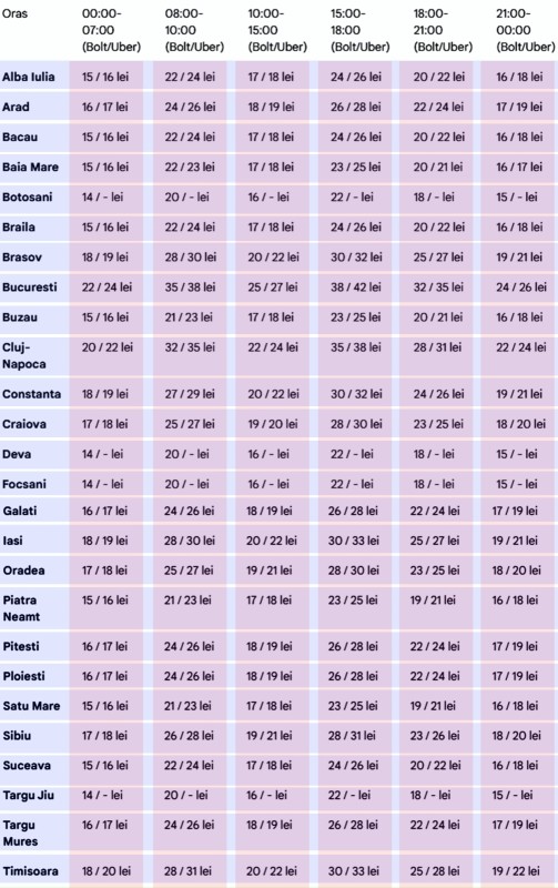 Cel mai mic tarif îl putem în Botoșani (18 lei), dar și în Deva, Focșani și Târgu Jiu. În București, tariful ar fi între 32 și 35 de lei. În Timișoara, prețul ar fi de25 – 28 de lei, în funcție de aplicația de ride sharing.