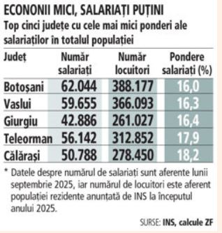 La polul opus, judeţele cu cele mai mici ponderi ale salariaţilor sunt Botoşani, Vaslui, Giurgiu, Teleorman şi Călăraşi.