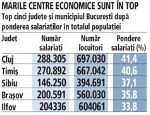 Bucureştiul se detaşează net de restul ţării, cu peste 65% din populaţie salariată. În topul judeţelor cu cele mai mari ponderi ale salariaţilor se află Cluj, Timiş, Sibiu, Braşov şi Ilfov.
