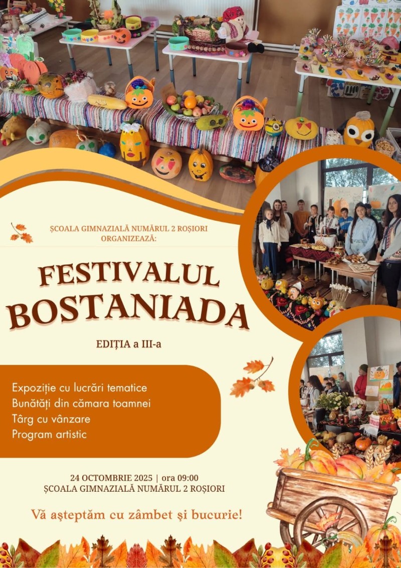Cu multă bucurie și voie bună! Așa se anunță a fi cea de-a treia ediție a Festivalului „Bostaniada”, organizat de Școala Gimnazială Nr. 2 din Roșiori pe 24 octombrie.