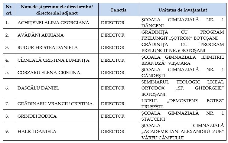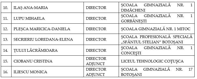 13 de directori și 2 directori adjuncți continuă activitatea de management în unitățile școlare pe care le-au condus și până acum, o schimbare de director având loc doar la Școala Gimnazială Nr. 1 Stăuceni, acolo unde fostul director nu a mai dorit să participe la selecție.
