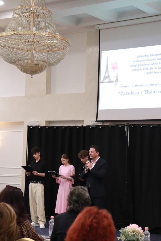 Sâmbătă, 25 aprilie 2026, elevii francofoni botoșăneni au trăit momente de entuziasm și efervescență cu prilejul celei de-a XV-a ediții a Festivalului francofon interjudețean de artă teatrală „Paroles et théâtre”. Evenimentul s-a desfășurat în sala „Mihai Eminescu” a Hotelului Rapsodia din Botoșani și se înscrie în rândul activităților patronate de Asociația Română a Profesorilor de Limba Franceză – filiala Botoșani.