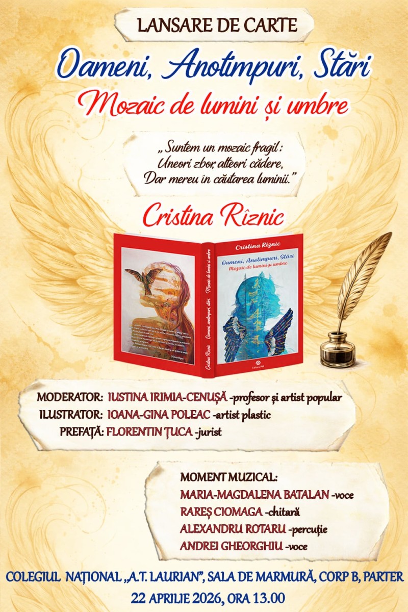 Ziua Mondială a Cărții va fi sărbătorită în acest an la Colegiul Național ”A. T. Laurian” cu o lansare a unui volum de poezii, intitulat ”OAMENI. ANOTIMPURI. STĂRI. Mozaic de lumini și umbre”, aparținând Cristinei Rîznic, profesor la această unitate de învățământ.