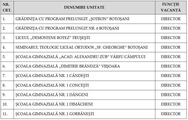 Funcțiile vacante vor fi ocupate prin detașare în interesul învățământului, până la organizarea concursului, dar nu mai târziu de 31 august 2026, în baza unei proceduri de selecție aprobate de Consiliul de administrație al Inspectoratului Școlar Județean Botoșani.