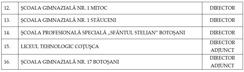 Cele 16 funcții de conducere, care devin vacante după încetarea Contractelor de management ale directorilor care au fost numiți urmare a promovării concursului din aprilie 2022, sunt următoarele: