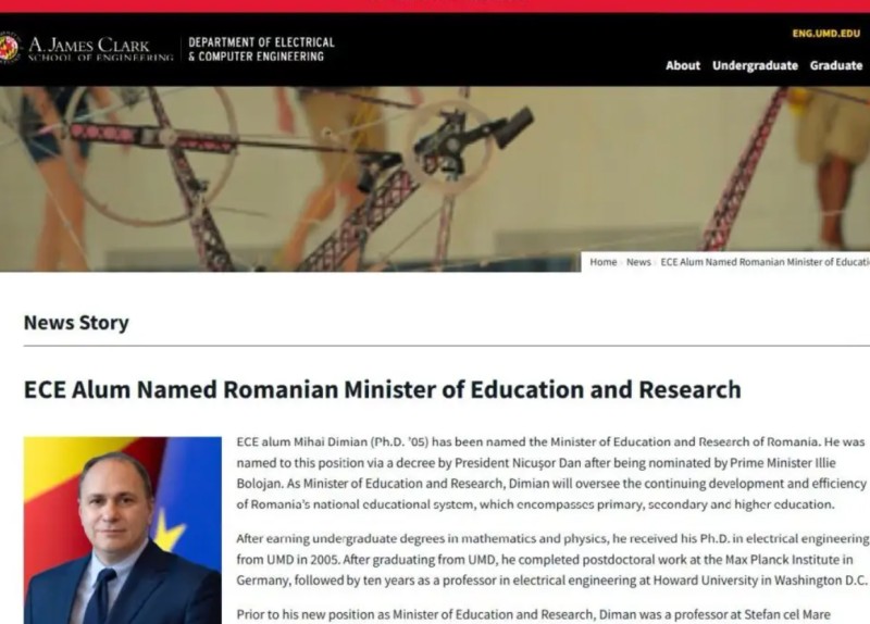 Ministrul Educației, Mihai Dimian, a preluat pe contul său de Facebook o declarație a fostului său conducător de doctorat de la Universitatea Maryland, din SUA, prof. univ. dr. Isaak Mayergoyz, publicată pe site-ul instituției academice după ce universitarul sucevean a fost numit ministru. Aprecierile profesorului american sunt puse în antiteză cu etichetări ale profesorului Dimian, făcute de unii comentatori din România.