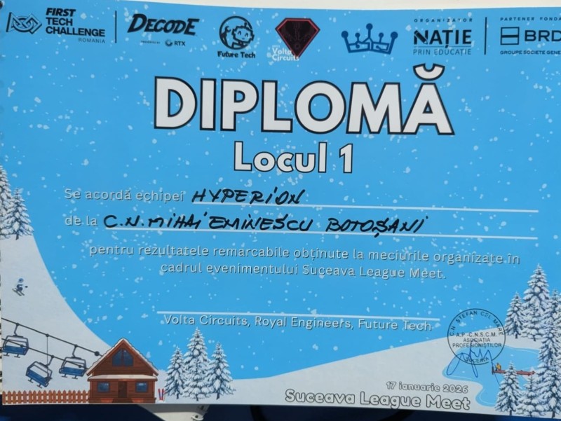 Pe 10 ianuarie, elevii Colegiului Național „Mihai Eminescu” au participat la competiția de robotică „Jurassic Peaks” din Piatra-Neamț, o ocazie excelentă de antrenament pentru etapa regională și un mediu propice schimbului de idei și experiențe cu alte echipe. La Piatra Neamț, echipa Hyperion a obținut Premiul „Best Robot Design” pentru cel mai bun design al robotului, în urma unei analize comparative a roboților participanți.