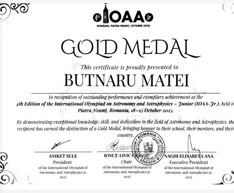 Printre premianți se află și Matei Butnaru, elev al Colegiului Național „Mihai Eminescu” din Botoșani, care a obținut medalia de aur în cadrul concursului.