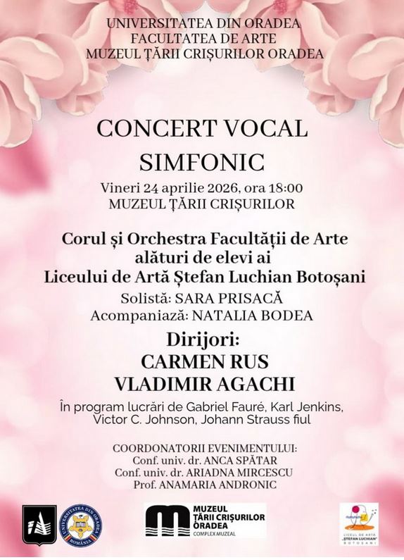Sala de conferințe a Muzeului Țării Crișurilor din Oradea va găzdui vineri, 24 aprilie, începând cu ora 18, un concertul vocal-simfonic care îi va avea ca protagoniști pe studenții Departamentului de Muzică al Facultății de Arte, Universitatea din Oradea, alături de elevii Liceului de Artă „Ștefan Luchian”, din Botoșani. Intrarea este liberă, în limita locurilor disponibile, precizează organizatorii.