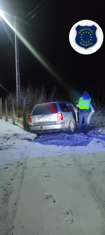După o urmărire extrem de periculoasă, în mare viteză, pe un drum acoperit cu zăpadă, șoferul mașinii care gonea încercând să scape de poliție, a pierdut controlul volanului și a intrat cu mașina într-un gard. În disperare de cauză, a abandonat autoturismul și a încercat să fugă pe câmp.
