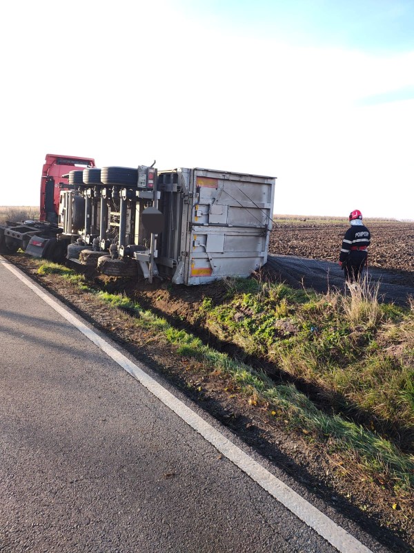 Vineri după-amiază, pompierii din cadrul Detașamentului Botoșani au fost solicitați să intervină la un accident rutier produs pe DN 24, pe ruta Botoșani – Săveni, unde un camion încărcat cu aproximativ 25 de tone de semințe de floarea-soarelui s-a răsturnat în afara părții carosabile.