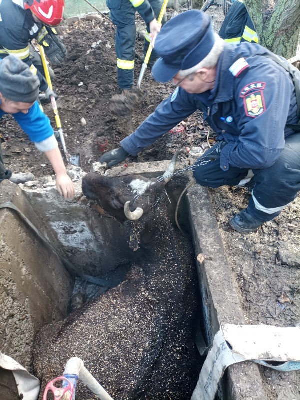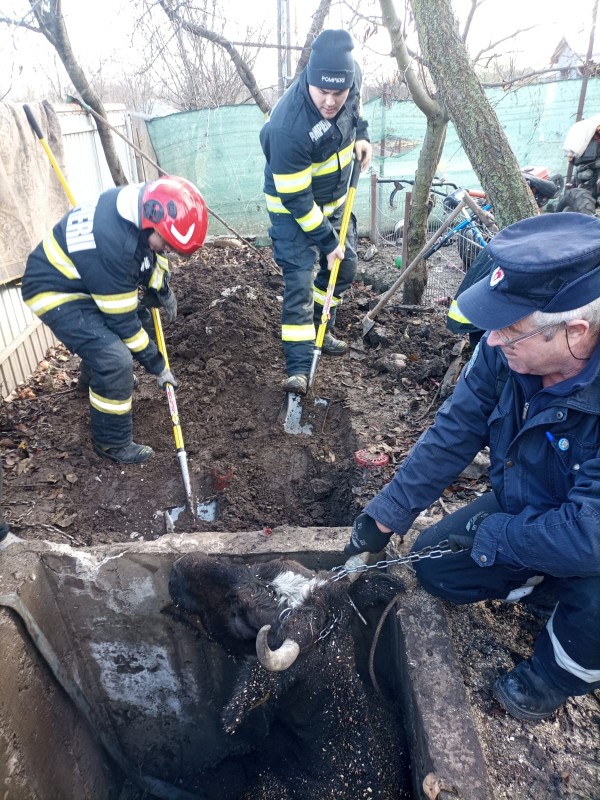 Pentru a o salva, aceștia au săpat în jurul căminului, au spart unul dintre pereții de beton și au amenajat o rampă care să permită eliberarea animalului. Din fericire, bovina a fost scoasă nevătămată.