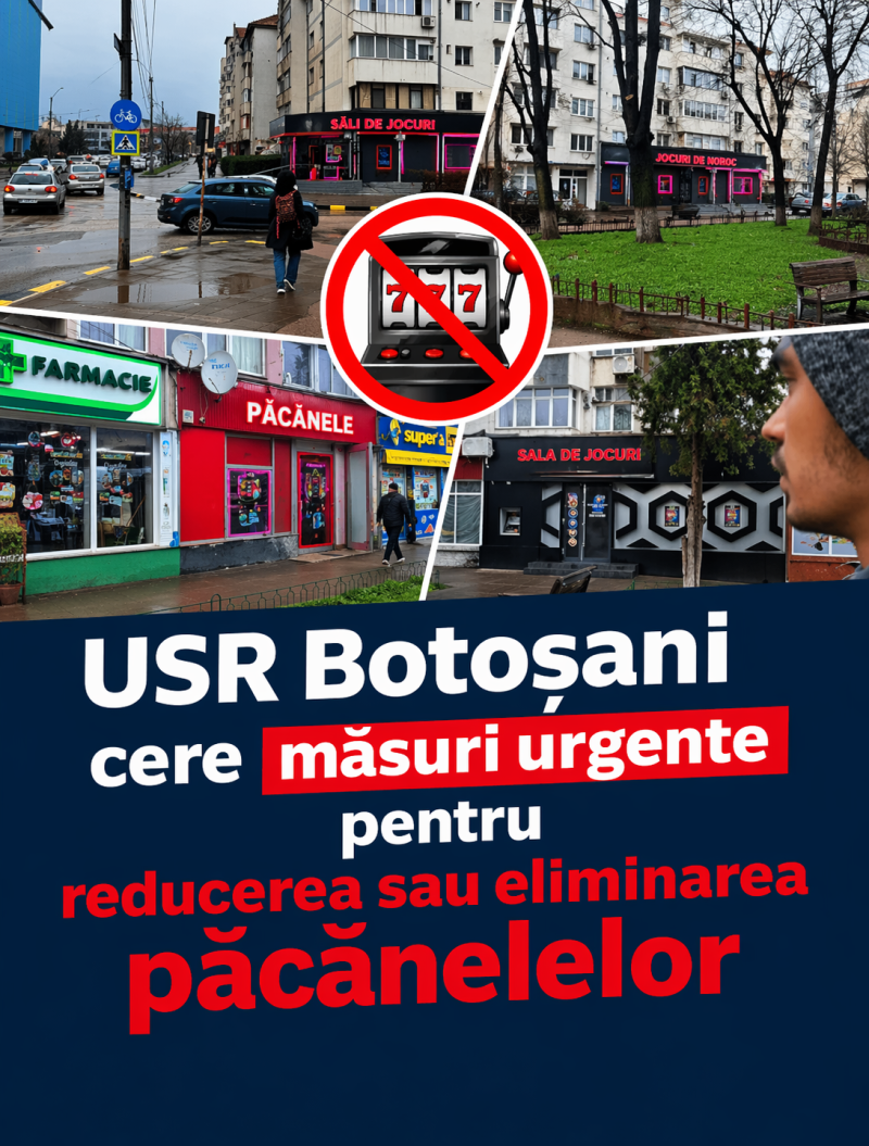 USR Botoșani a depus, înainte de Sfintele Paște, două propuneri clare de hotărâri de Consiliu Local pentru închiderea, respectiv, limitarea păcănelelor. De ce? Pentru că efectele acestor localuri pot fi văzute zilnic: familii distruse, tineri atrași în dependență și cartiere sufocate de săli de jocuri.