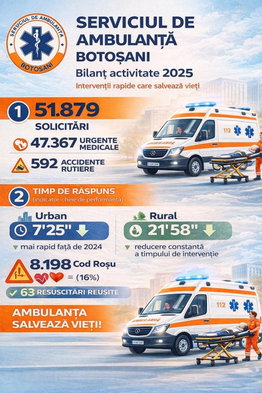 Serviciul Județean de Ambulanță Botoșani își prezintă bilanțul activității desfășurate în anul 2025, evidențiind în acest fel ”creșterea eficienței intervențiilor, îmbunătățirea timpilor de răspuns și gestionarea unui număr ridicat de urgențe medicale majore”, în beneficiul populației din Județul Botoșani.