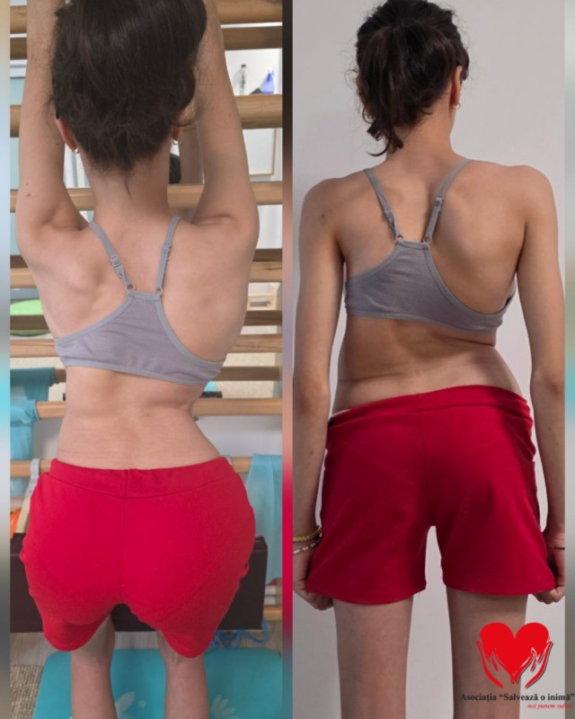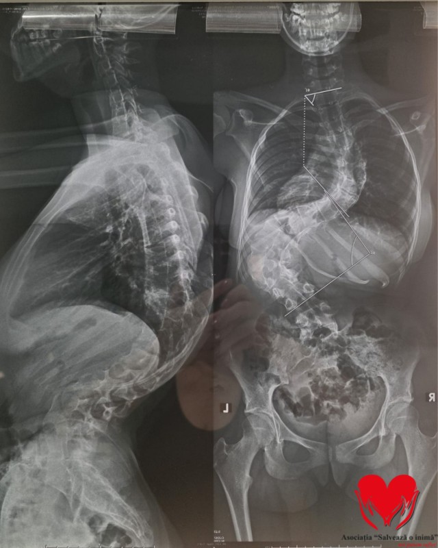 Andreea a fost diagnosticată încă de la o vârstă fragedă cu scolioză. În ciuda tuturor tratamentelor urmate ani la rând – kinetoterapie, fizioterapie, masaj, purtarea corsetului ortopedic și restricții severe – boala a continuat să avanseze. Astăzi, medicii vorbesc despre scolioză severă, cu o curbură de 31 de grade lombar și 61 de grade toracic, valori extrem de periculoase pentru un copil aflat în plină creștere.